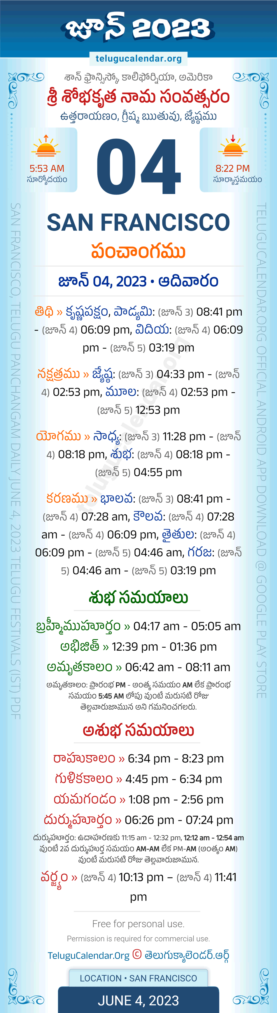 San Francisco Panchangam June 4, 2023 Daily Sheet in Telugu... San Francisco Telugu Panchangam Sunday, June 04, 2023, Today's San Francisco Tithi: Krishna Paksham, Padyami: (Jun 3) 08:41 pm - (Jun 4) 06:09 pm, Vidiya: (Jun 4) 06:09 pm - (Jun 5) 03:19 pm, Today's San Francisco Nakshatram: Jyestha: (Jun 3) 04:33 pm - (Jun 4) 02:53 pm, Moola: (Jun 4) 02:53 pm - (Jun 5) 12:53 pm, Telugu Year: Sri Sobhakritu Nama Samvatsaram, Vedic Aayana: Uttarayanam, Vedic Rutuvu: Grishma, Chandramasa (Amanta): Jyeshtamu. Below image showing information about the 5 attributes of the day, viz., Varam, Tithi, Nakshatram, Yogam & Karanam along with starting and end timings. Read more
