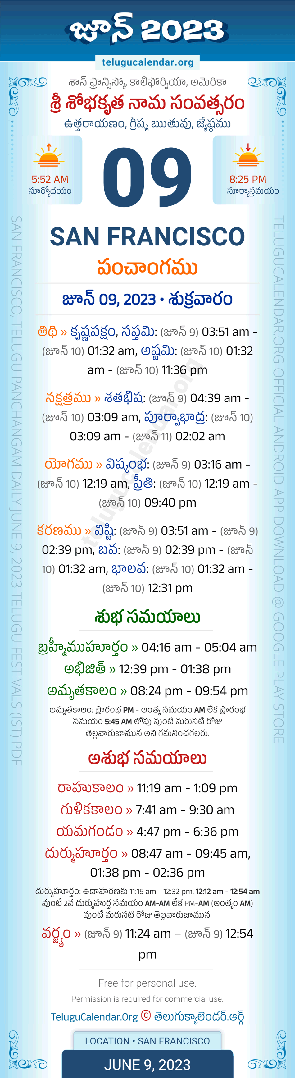 San Francisco Panchangam June 9, 2023 Daily Sheet in Telugu... San Francisco Telugu Panchangam Friday, June 09, 2023, Today's San Francisco Tithi: Krishna Paksham, Saptami: (Jun 9) 03:51 am - (Jun 10) 01:32 am, Ashtami: (Jun 10) 01:32 am - (Jun 10) 11:36 pm, Today's San Francisco Nakshatram: Shathabhisha: (Jun 9) 04:39 am - (Jun 10) 03:09 am, Purva Bhadrapada: (Jun 10) 03:09 am - (Jun 11) 02:02 am, Telugu Year: Sri Sobhakritu Nama Samvatsaram, Vedic Aayana: Uttarayanam, Vedic Rutuvu: Grishma, Chandramasa (Amanta): Jyeshtamu. Below image showing information about the 5 attributes of the day, viz., Varam, Tithi, Nakshatram, Yogam & Karanam along with starting and end timings. Read more