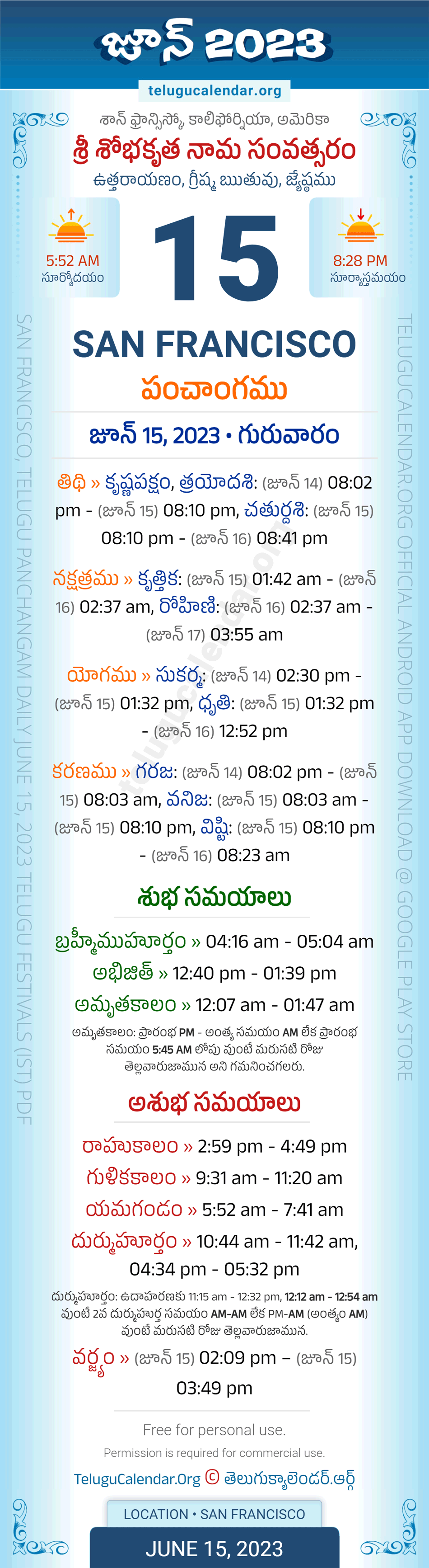 Download » June 15, 2023 » San Francisco (USA) Telugu Panchangam Daily Sheet with Auspicious and Inauspicious Timings.