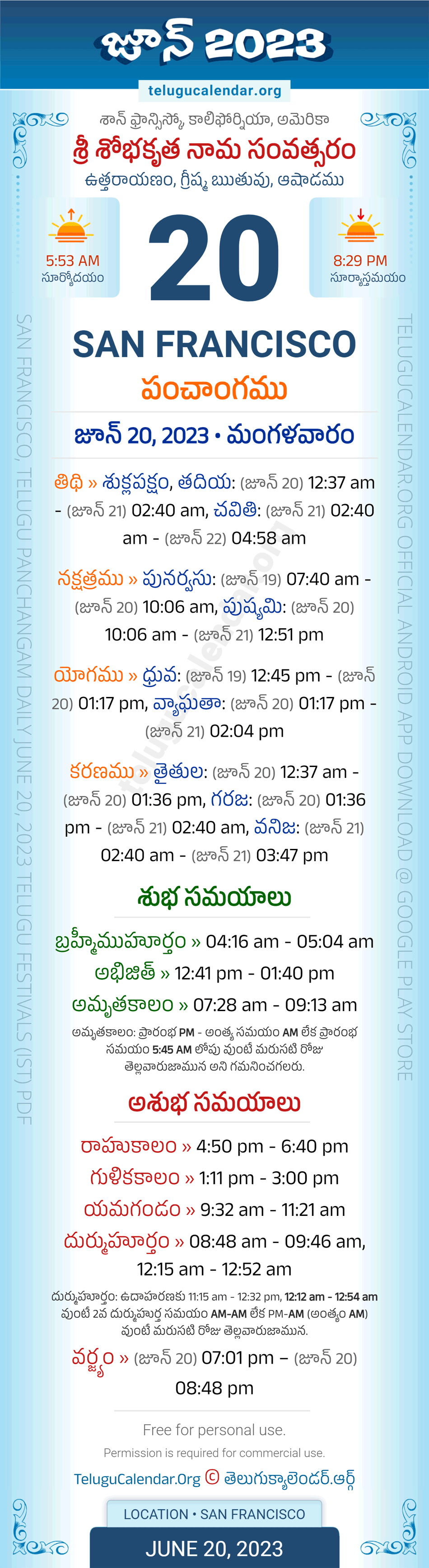 Download » June 20, 2023 » San Francisco (USA) Telugu Panchangam Daily Sheet with Auspicious and Inauspicious Timings.
