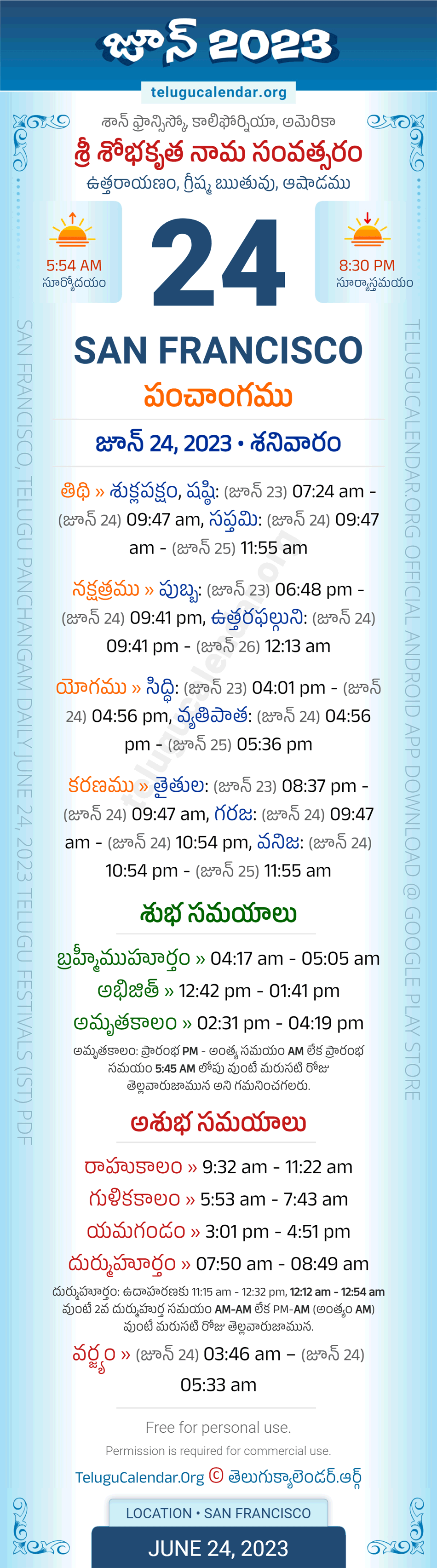 Download » June 24, 2023 » San Francisco (USA) Telugu Panchangam Daily Sheet with Auspicious and Inauspicious Timings.