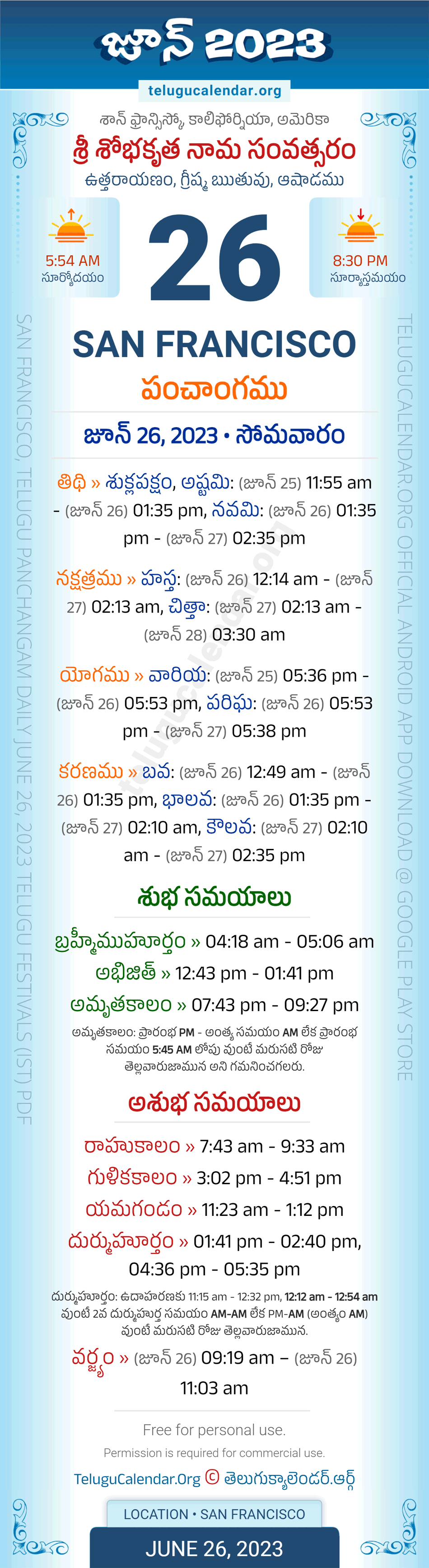 San Francisco Panchangam June 26, 2023 Daily Sheet in Telugu... San Francisco Telugu Panchangam Monday, June 26, 2023, Today's San Francisco Tithi: Sukla Paksham, Ashtami: (Jun 25) 11:55 am - (Jun 26) 01:35 pm, Navami: (Jun 26) 01:35 pm - (Jun 27) 02:35 pm, Today's San Francisco Nakshatram: Hastha: (Jun 26) 12:14 am - (Jun 27) 02:13 am, Chiththa: (Jun 27) 02:13 am - (Jun 28) 03:30 am, Telugu Year: Sri Sobhakritu Nama Samvatsaram, Vedic Aayana: Uttarayanam, Vedic Rutuvu: Grishma, Chandramasa (Amanta): Ashadhamu. Below image showing information about the 5 attributes of the day, viz., Varam, Tithi, Nakshatram, Yogam & Karanam along with starting and end timings. Read more