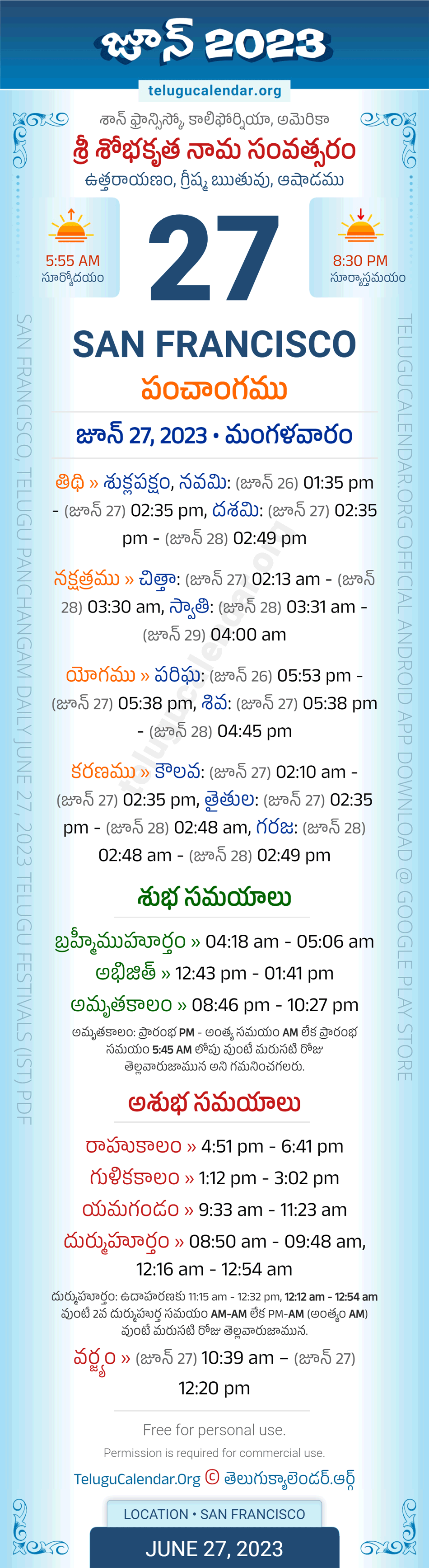 Apart from the Panchangam June 27, 2023 San Francisco Telugu Calendar Daily Sheet, you can also find the Sunrise and Sunset (Middle Limb) timings, Paksham, Telugu Year, Yanam, Rutuvu, Telugu Month. Today's San Francisco Auspicious Timings June 27, 2023 (Shubha Muhuratam Today Good Timings like Abhijit Muhurtham, Amruta Kalam & Brahma Muhurtham) and Today's San Francisco Inauspicious Timings June 27, 2023 (Bad Timings like Durmuhurtham, Rahukalam, Gulika kalam & Yamagandam) with starting and end timings in the above image.