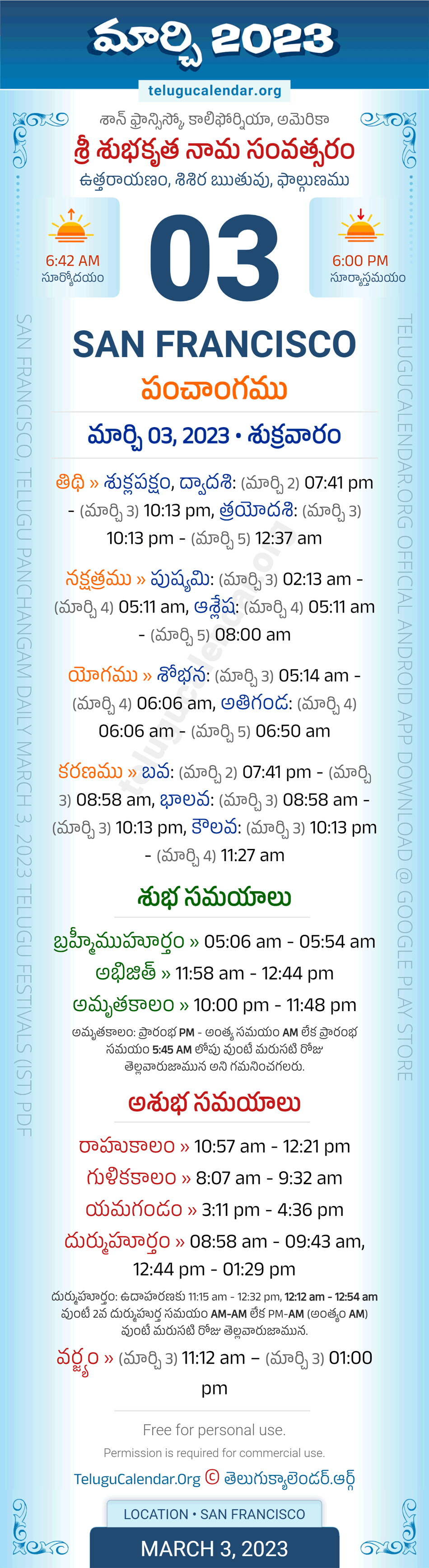 Download » March 3, 2023 » San Francisco (USA) Telugu Panchangam Daily Sheet with Auspicious and Inauspicious Timings.