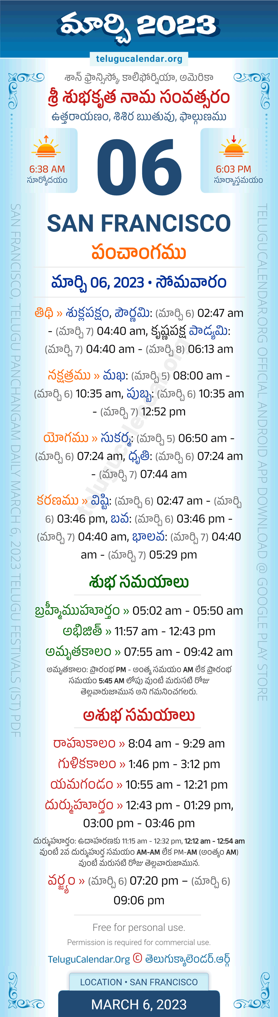 Download » March 6, 2023 » San Francisco (USA) Telugu Panchangam Daily Sheet with Auspicious and Inauspicious Timings.