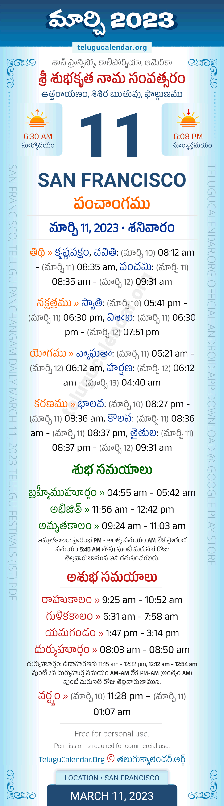 Download » March 11, 2023 » San Francisco (USA) Telugu Panchangam Daily Sheet with Auspicious and Inauspicious Timings.