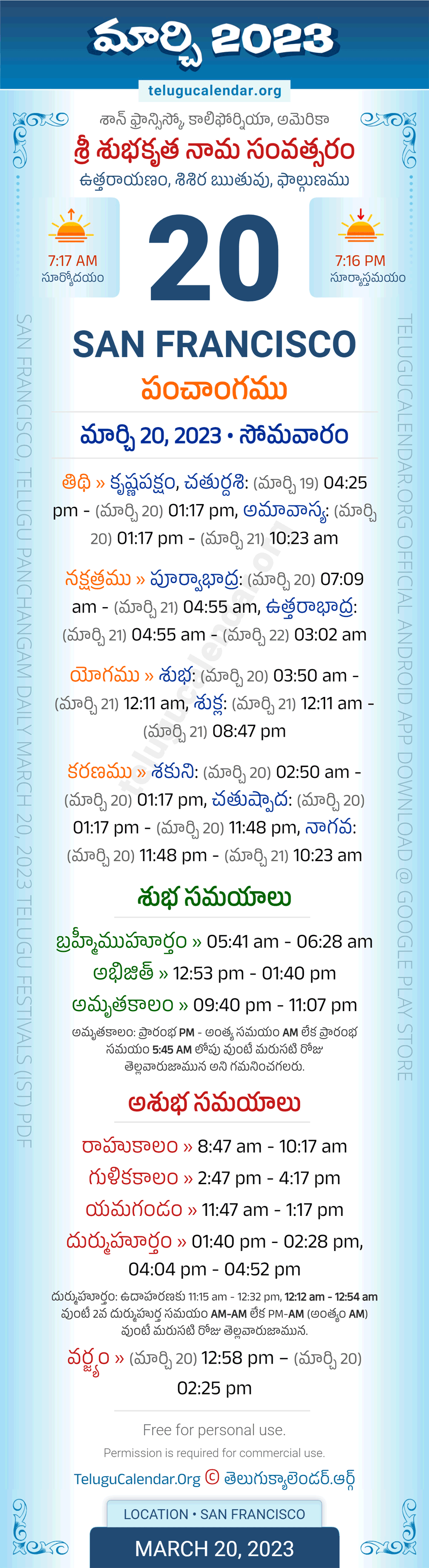 Download » March 20, 2023 » San Francisco (USA) Telugu Panchangam Daily Sheet with Auspicious and Inauspicious Timings.