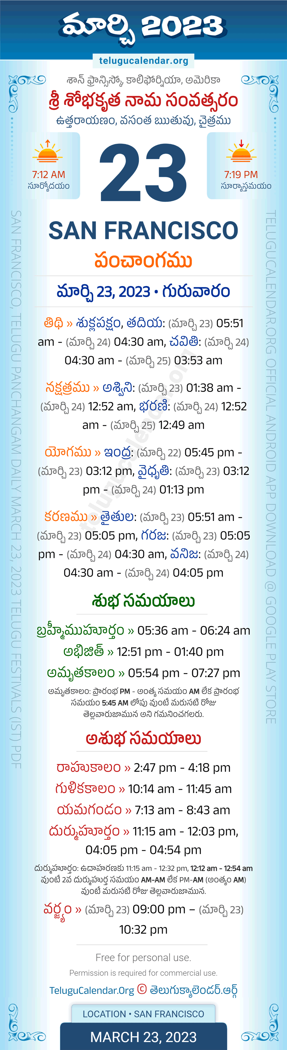 Download » March 23, 2023 » San Francisco (USA) Telugu Panchangam Daily Sheet with Auspicious and Inauspicious Timings.