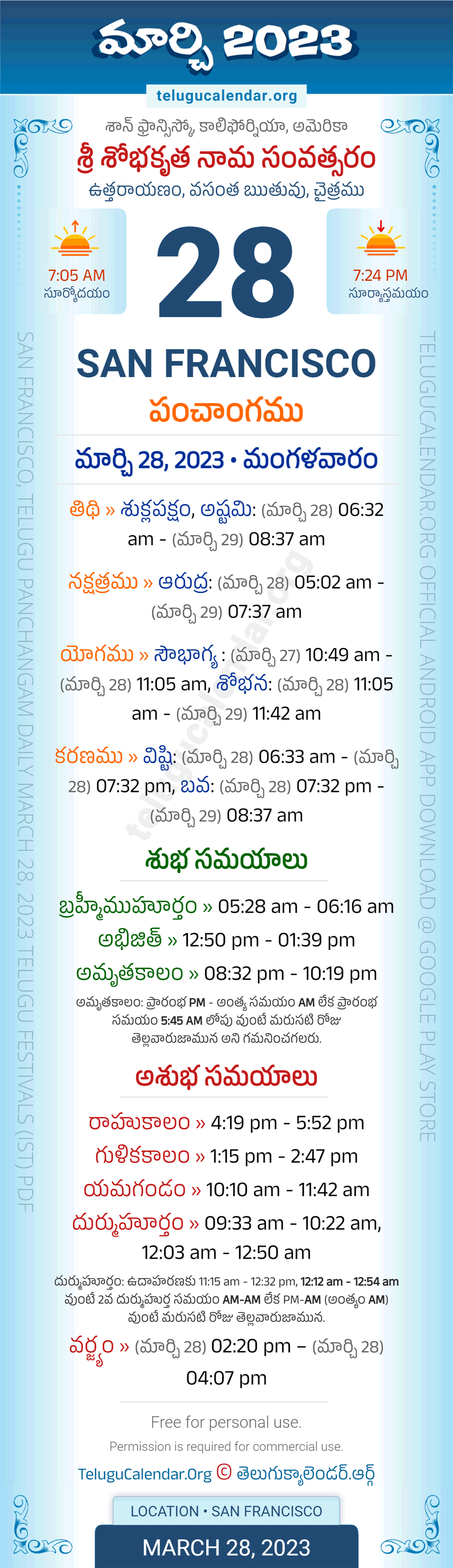 Download » March 28, 2023 » San Francisco (USA) Telugu Panchangam Daily Sheet with Auspicious and Inauspicious Timings.