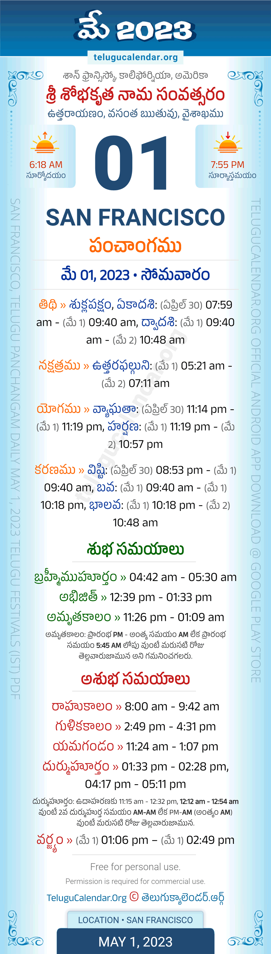 Download » May 1, 2023 » San Francisco (USA) Telugu Panchangam Daily Sheet with Auspicious and Inauspicious Timings.