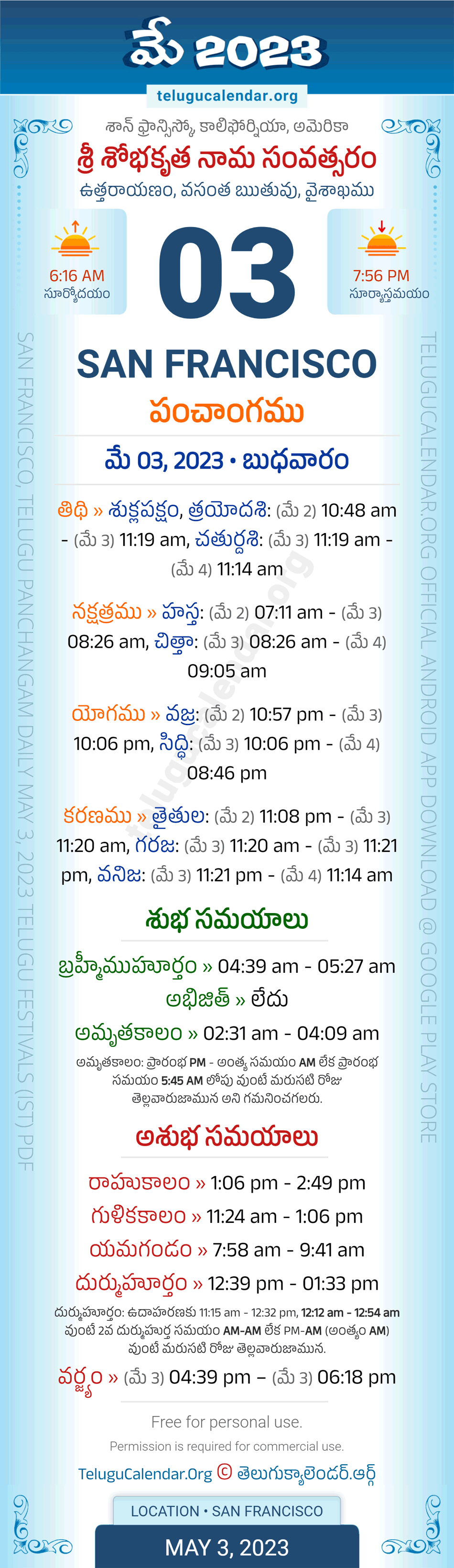 San Francisco Panchangam May 3, 2023 Daily Sheet in Telugu... San Francisco Telugu Panchangam Wednesday, May 03, 2023, Today's San Francisco Tithi: Sukla Paksham, Trayodashi: (May 2) 10:48 am - (May 3) 11:19 am, Chaturdashi: (May 3) 11:19 am - (May 4) 11:14 am, Today's San Francisco Nakshatram: Hastha: (May 2) 07:11 am - (May 3) 08:26 am, Chiththa: (May 3) 08:26 am - (May 4) 09:05 am, Telugu Year: Sri Sobhakritu Nama Samvatsaram, Vedic Aayana: Uttarayanam, Vedic Rutuvu: Vasanta, Chandramasa (Amanta): Vaisakhamu. Below image showing information about the 5 attributes of the day, viz., Varam, Tithi, Nakshatram, Yogam & Karanam along with starting and end timings. Read more
