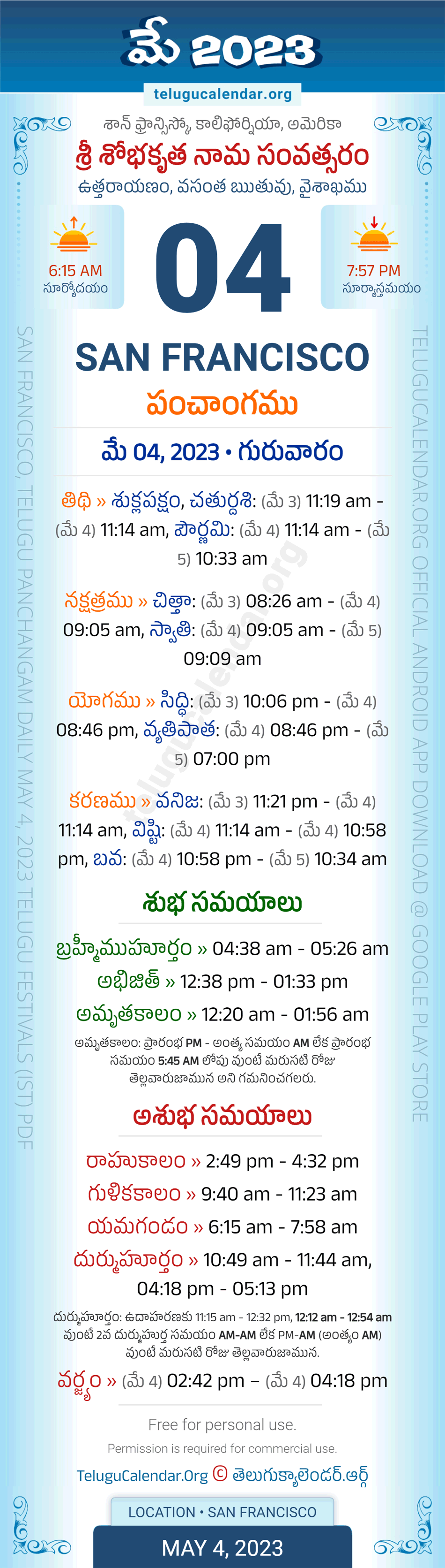 Apart from the Panchangam May 4, 2023 San Francisco Telugu Calendar Daily Sheet, you can also find the Sunrise and Sunset (Middle Limb) timings, Paksham, Telugu Year, Yanam, Rutuvu, Telugu Month. Today's San Francisco Auspicious Timings May 4, 2023 (Shubha Muhuratam Today Good Timings like Abhijit Muhurtham, Amruta Kalam & Brahma Muhurtham) and Today's San Francisco Inauspicious Timings May 4, 2023 (Bad Timings like Durmuhurtham, Rahukalam, Gulika kalam & Yamagandam) with starting and end timings in the above image.