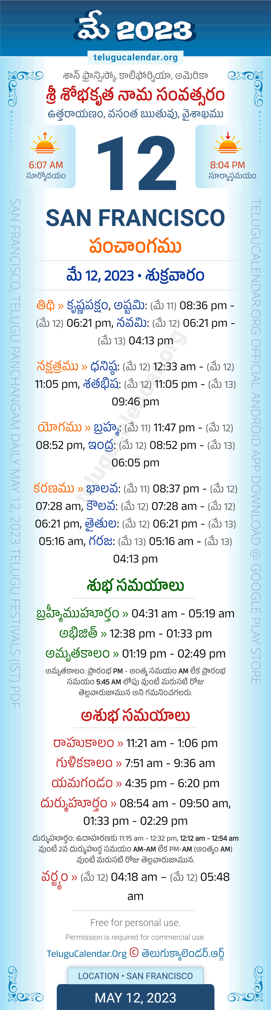 San Francisco Panchangam May 12, 2023 Daily Sheet in Telugu... San Francisco Telugu Panchangam Friday, May 12, 2023, Today's San Francisco Tithi: Krishna Paksham, Ashtami: (May 11) 08:36 pm - (May 12) 06:21 pm, Navami: (May 12) 06:21 pm - (May 13) 04:13 pm, Today's San Francisco Nakshatram: Dhanishta: (May 12) 12:33 am - (May 12) 11:05 pm, Shathabhisha: (May 12) 11:05 pm - (May 13) 09:46 pm, Telugu Year: Sri Sobhakritu Nama Samvatsaram, Vedic Aayana: Uttarayanam, Vedic Rutuvu: Vasanta, Chandramasa (Amanta): Vaisakhamu. Below image showing information about the 5 attributes of the day, viz., Varam, Tithi, Nakshatram, Yogam & Karanam along with starting and end timings. Read more