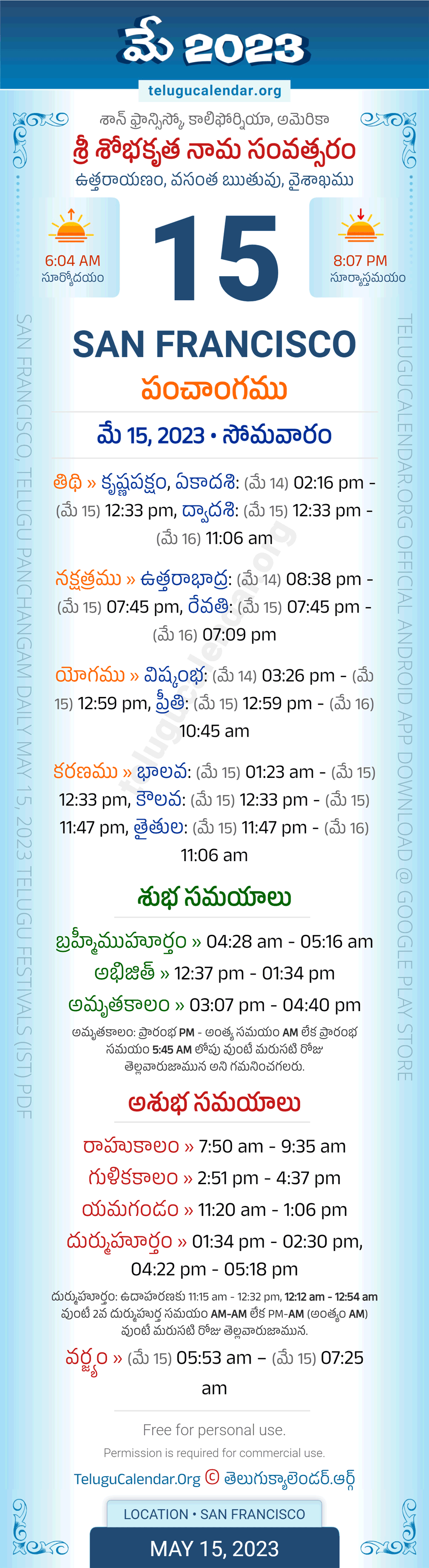 Download » May 15, 2023 » San Francisco (USA) Telugu Panchangam Daily Sheet with Auspicious and Inauspicious Timings.