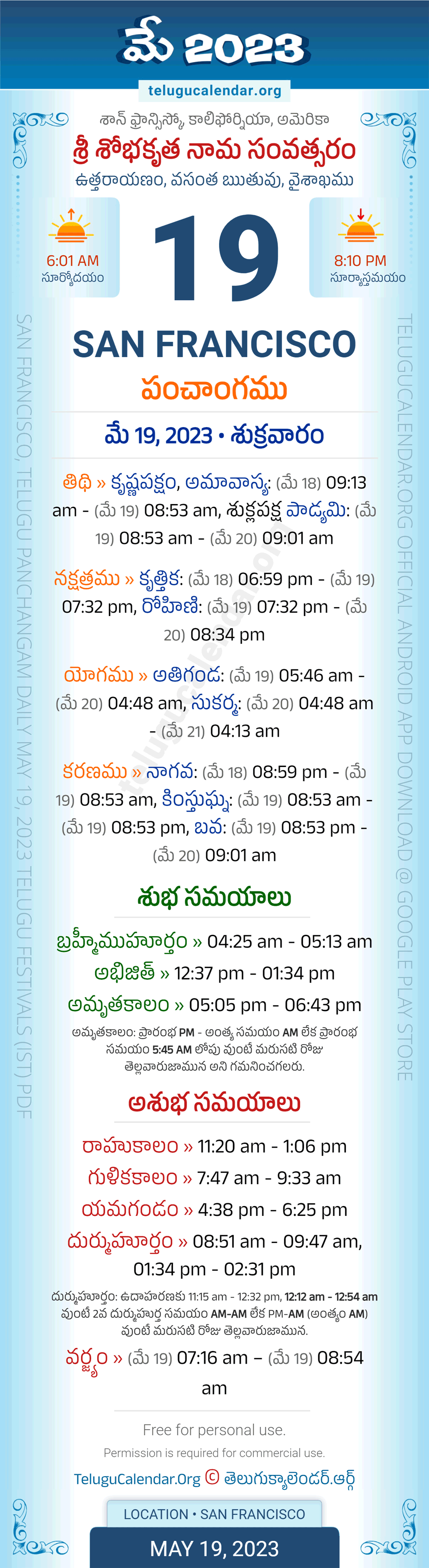 San Francisco Panchangam May 19, 2023 Daily Sheet in Telugu... San Francisco Telugu Panchangam Friday, May 19, 2023, Today's San Francisco Tithi: Krishna Paksham, Amavasya: (May 18) 09:13 am - (May 19) 08:53 am, Sukla Paksha Padyami: (May 19) 08:53 am - (May 20) 09:01 am, Today's San Francisco Nakshatram: Krithika: (May 18) 06:59 pm - (May 19) 07:32 pm, Krithika: (May 19) 07:32 pm - (May 20) 08:34 pm, Telugu Year: Sri Sobhakritu Nama Samvatsaram, Vedic Aayana: Uttarayanam, Vedic Rutuvu: Vasanta, Chandramasa (Amanta): Vaisakhamu. Below image showing information about the 5 attributes of the day, viz., Varam, Tithi, Nakshatram, Yogam & Karanam along with starting and end timings. Read more