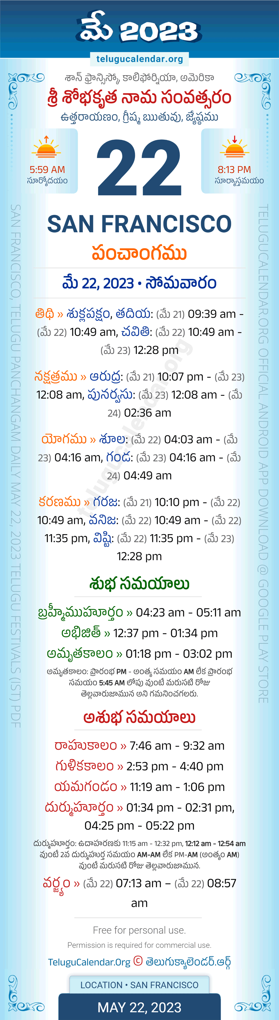 Download » May 22, 2023 » San Francisco (USA) Telugu Panchangam Daily Sheet with Auspicious and Inauspicious Timings.