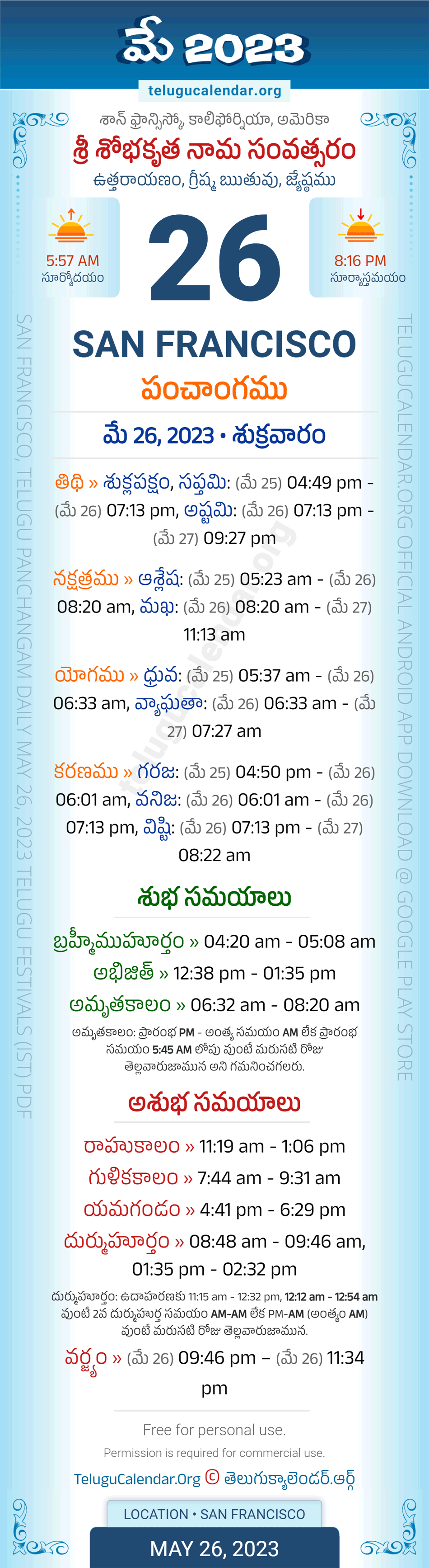 Download » May 26, 2023 » San Francisco (USA) Telugu Panchangam Daily Sheet with Auspicious and Inauspicious Timings.