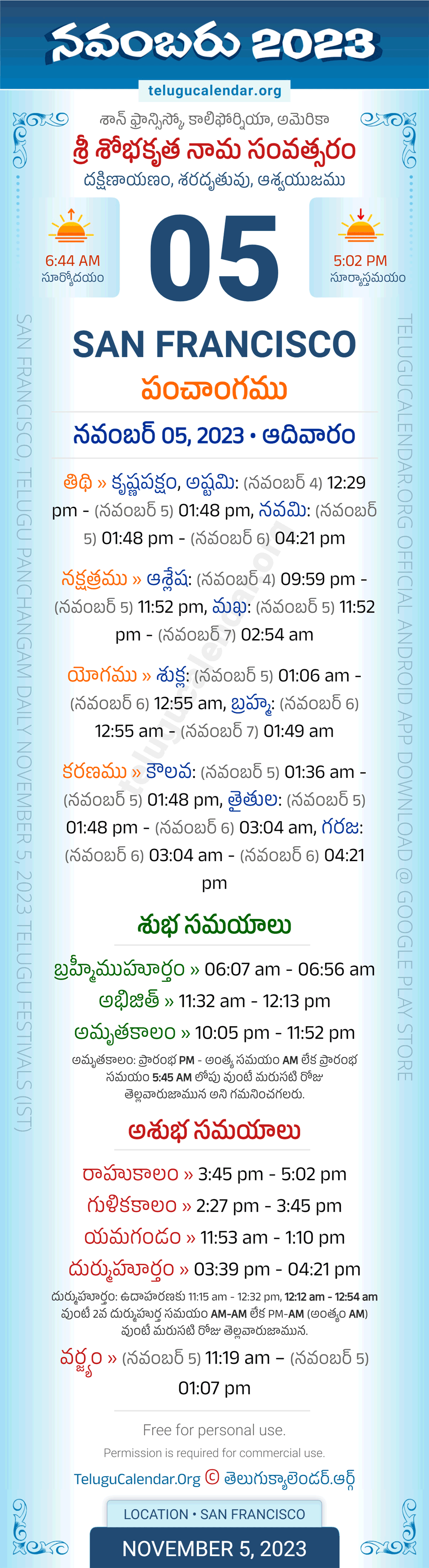 Apart from the Panchangam November 5, 2023 San Francisco Telugu Calendar Daily Sheet, you can also find the Sunrise and Sunset (Middle Limb) timings, Paksham, Telugu Year, Yanam, Rutuvu, Telugu Month. Today's San Francisco Auspicious Timings November 5, 2023 (Shubha Muhuratam Today Good Timings like Abhijit Muhurtham, Amruta Kalam & Brahma Muhurtham) and Today's San Francisco Inauspicious Timings November 5, 2023 (Bad Timings like Durmuhurtham, Rahukalam, Gulika kalam & Yamagandam) with starting and end timings in the above image.