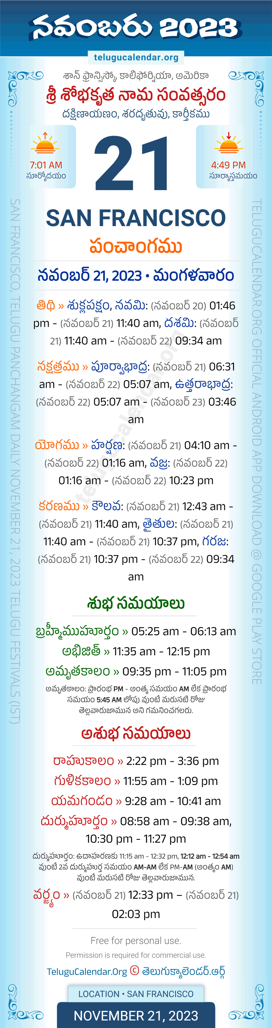 Download » November 21, 2023 » San Francisco (USA) Telugu Panchangam Daily Sheet with Auspicious and Inauspicious Timings.