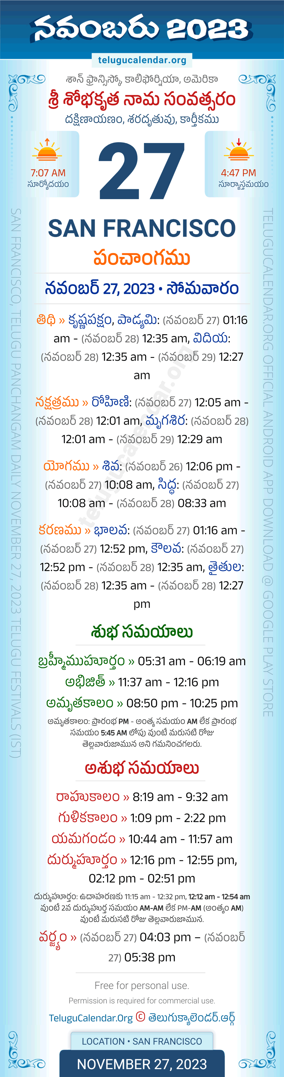 San Francisco Panchangam November 27, 2023 Daily Sheet in Telugu... San Francisco Telugu Panchangam Monday, November 27, 2023, Today's San Francisco Tithi: Krishna Paksham, Padyami: (Nov 27) 01:16 am - (Nov 28) 12:35 am, Vidiya: (Nov 28) 12:35 am - (Nov 29) 12:27 am, Today's San Francisco Nakshatram: Krithika: (Nov 27) 12:05 am - (Nov 28) 12:01 am, Mrigasira: (Nov 28) 12:01 am - (Nov 29) 12:29 am, Telugu Year: Sri Sobhakritu Nama Samvatsaram, Vedic Aayana: Dakshinayanam, Vedic Rutuvu: Sharad, Chandramasa (Amanta): Kartikamu. Below image showing information about the 5 attributes of the day, viz., Varam, Tithi, Nakshatram, Yogam & Karanam along with starting and end timings. Read more