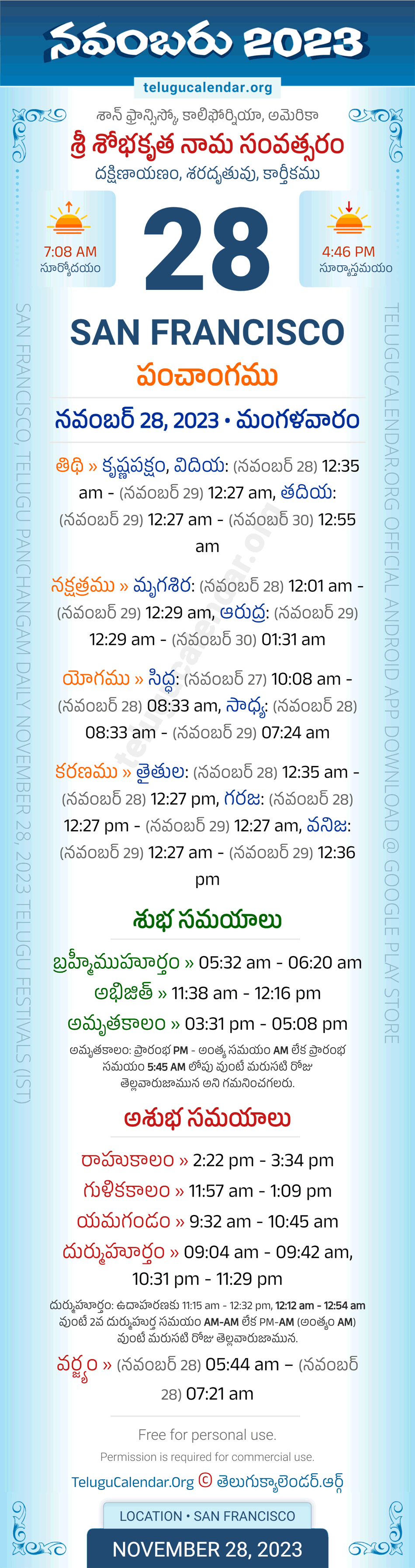 San Francisco Panchangam November 28, 2023 Daily Sheet in Telugu... San Francisco Telugu Panchangam Tuesday, November 28, 2023, Today's San Francisco Tithi: Krishna Paksham, Vidiya: (Nov 28) 12:35 am - (Nov 29) 12:27 am, Thadiya: (Nov 29) 12:27 am - (Nov 30) 12:55 am, Today's San Francisco Nakshatram: Mrigasira: (Nov 28) 12:01 am - (Nov 29) 12:29 am, Arudra: (Nov 29) 12:29 am - (Nov 30) 01:31 am, Telugu Year: Sri Sobhakritu Nama Samvatsaram, Vedic Aayana: Dakshinayanam, Vedic Rutuvu: Sharad, Chandramasa (Amanta): Kartikamu. Below image showing information about the 5 attributes of the day, viz., Varam, Tithi, Nakshatram, Yogam & Karanam along with starting and end timings. Read more