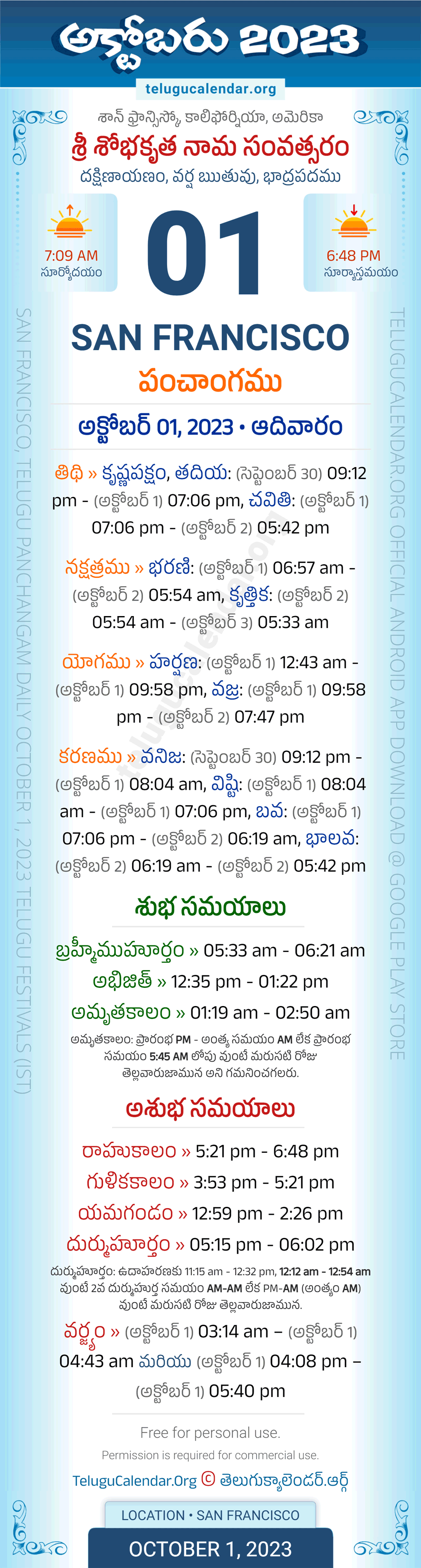 San Francisco Panchangam October 1, 2023 Daily Sheet in Telugu... San Francisco Telugu Panchangam Sunday, October 01, 2023, Today's San Francisco Tithi: Krishna Paksham, Thadiya: (Sep 30) 09:12 pm - (Oct 1) 07:06 pm, Chavithi: (Oct 1) 07:06 pm - (Oct 2) 05:42 pm, Today's San Francisco Nakshatram: Bharani: (Oct 1) 06:57 am - (Oct 2) 05:54 am, Krithika: (Oct 2) 05:54 am - (Oct 3) 05:33 am, Telugu Year: Sri Sobhakritu Nama Samvatsaram, Vedic Aayana: Dakshinayanam, Vedic Rutuvu: Varsha, Chandramasa (Amanta): Bhadrapadamu. Below image showing information about the 5 attributes of the day, viz., Varam, Tithi, Nakshatram, Yogam & Karanam along with starting and end timings. Read more