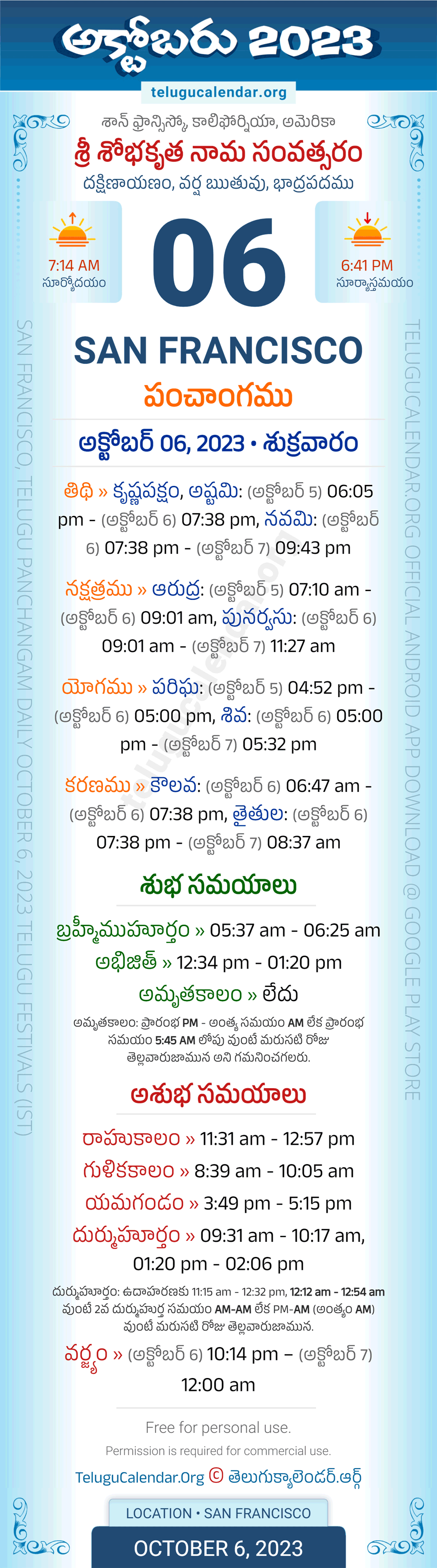 Download » October 6, 2023 » San Francisco (USA) Telugu Panchangam Daily Sheet with Auspicious and Inauspicious Timings.