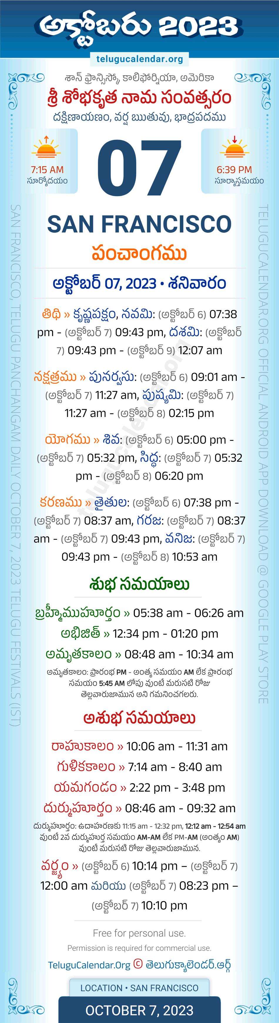 Apart from the Panchangam October 7, 2023 San Francisco Telugu Calendar Daily Sheet, you can also find the Sunrise and Sunset (Middle Limb) timings, Paksham, Telugu Year, Yanam, Rutuvu, Telugu Month. Today's San Francisco Auspicious Timings October 7, 2023 (Shubha Muhuratam Today Good Timings like Abhijit Muhurtham, Amruta Kalam & Brahma Muhurtham) and Today's San Francisco Inauspicious Timings October 7, 2023 (Bad Timings like Durmuhurtham, Rahukalam, Gulika kalam & Yamagandam) with starting and end timings in the above image.