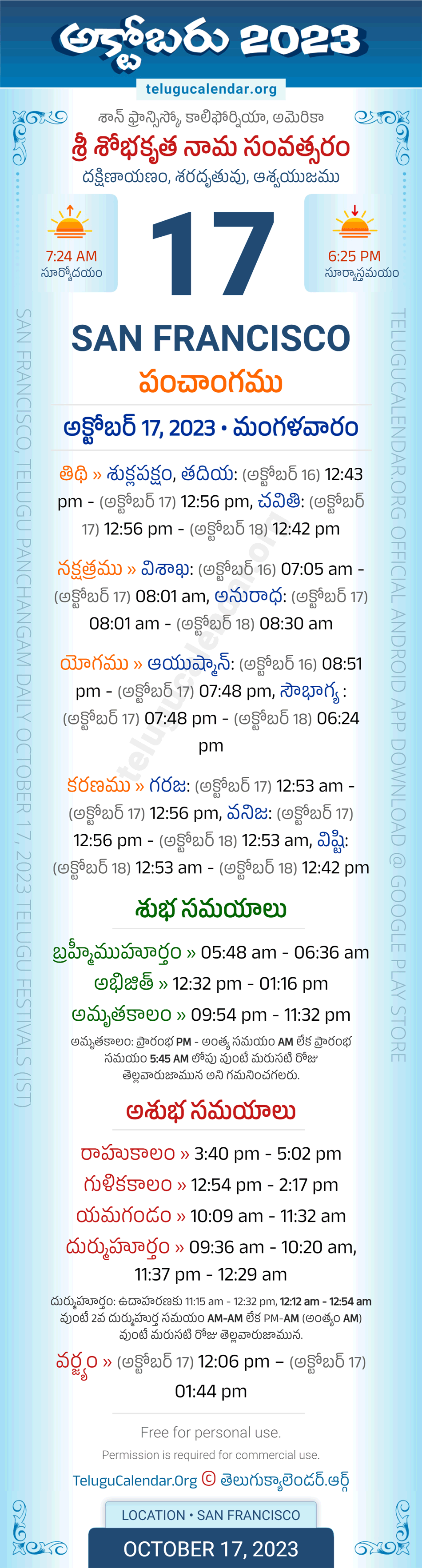 Download » October 17, 2023 » San Francisco (USA) Telugu Panchangam Daily Sheet with Auspicious and Inauspicious Timings.