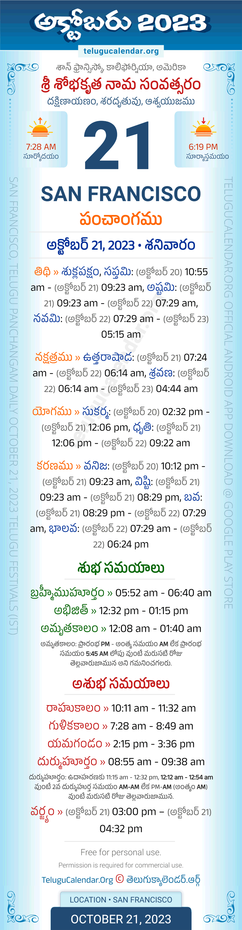 San Francisco Panchangam October 21, 2023 Daily Sheet in Telugu... San Francisco Telugu Panchangam Saturday, October 21, 2023, Today's San Francisco Tithi: Sukla Paksham, Saptami: (Oct 20) 10:55 am - (Oct 21) 09:23 am, Ashtami: (Oct 21) 09:23 am - (Oct 22) 07:29 am, Navami: (Oct 22) 07:29 am - (Oct 23) 05:15 am, Today's San Francisco Nakshatram: Uttara Ashadha: (Oct 21) 07:24 am - (Oct 22) 06:14 am, Sravanamu: (Oct 22) 06:14 am - (Oct 23) 04:44 am, Telugu Year: Sri Sobhakritu Nama Samvatsaram, Vedic Aayana: Dakshinayanam, Vedic Rutuvu: Sharad, Chandramasa (Amanta): Ashwayujamu. Below image showing information about the 5 attributes of the day, viz., Varam, Tithi, Nakshatram, Yogam & Karanam along with starting and end timings. Read more