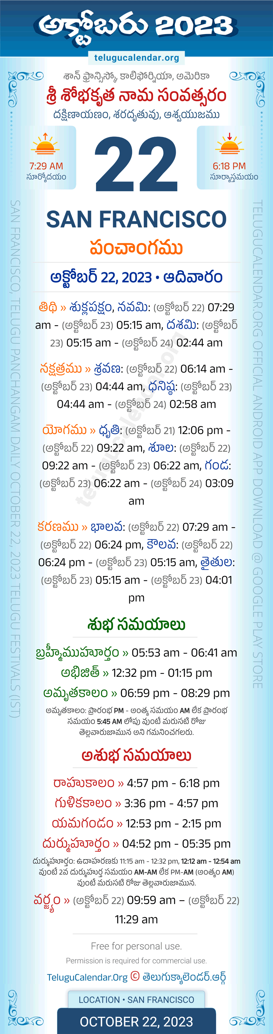 San Francisco Panchangam October 22, 2023 Daily Sheet in Telugu... San Francisco Telugu Panchangam Sunday, October 22, 2023, Today's San Francisco Tithi: Sukla Paksham, Navami: (Oct 22) 07:29 am - (Oct 23) 05:15 am, Dashami: (Oct 23) 05:15 am - (Oct 24) 02:44 am, Today's San Francisco Nakshatram: Sravanamu: (Oct 22) 06:14 am - (Oct 23) 04:44 am, Dhanishta: (Oct 23) 04:44 am - (Oct 24) 02:58 am, Telugu Year: Sri Sobhakritu Nama Samvatsaram, Vedic Aayana: Dakshinayanam, Vedic Rutuvu: Sharad, Chandramasa (Amanta): Ashwayujamu. Below image showing information about the 5 attributes of the day, viz., Varam, Tithi, Nakshatram, Yogam & Karanam along with starting and end timings. Read more