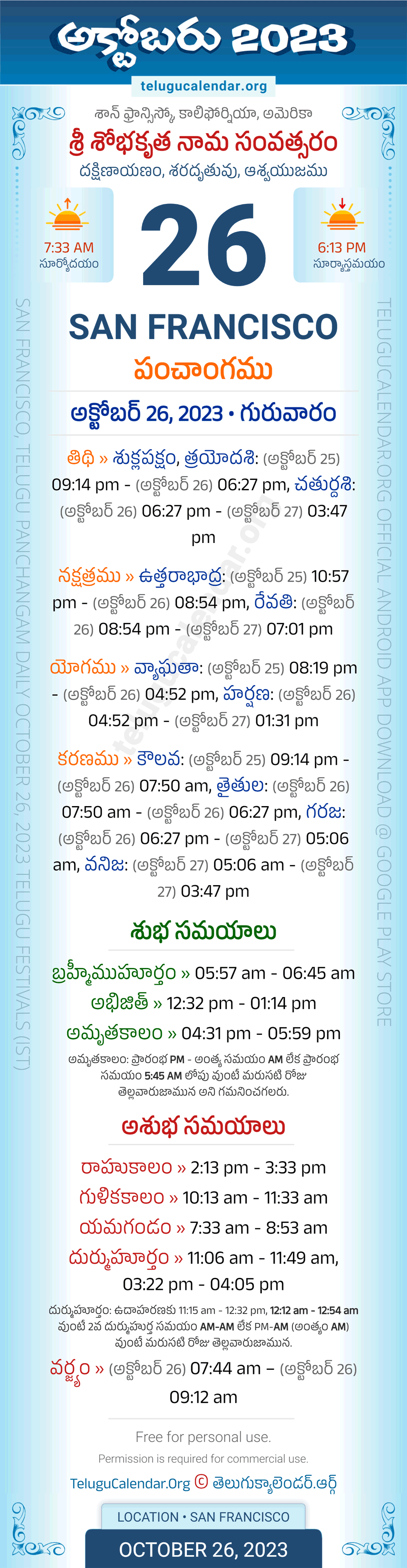 San Francisco Panchangam October 26, 2023 Daily Sheet in Telugu... San Francisco Telugu Panchangam Thursday, October 26, 2023, Today's San Francisco Tithi: Sukla Paksham, Trayodashi: (Oct 25) 09:14 pm - (Oct 26) 06:27 pm, Chaturdashi: (Oct 26) 06:27 pm - (Oct 27) 03:47 pm, Today's San Francisco Nakshatram: Uttara Bhadrapada: (Oct 25) 10:57 pm - (Oct 26) 08:54 pm, Revathi: (Oct 26) 08:54 pm - (Oct 27) 07:01 pm, Telugu Year: Sri Sobhakritu Nama Samvatsaram, Vedic Aayana: Dakshinayanam, Vedic Rutuvu: Sharad, Chandramasa (Amanta): Ashwayujamu. Below image showing information about the 5 attributes of the day, viz., Varam, Tithi, Nakshatram, Yogam & Karanam along with starting and end timings. Read more