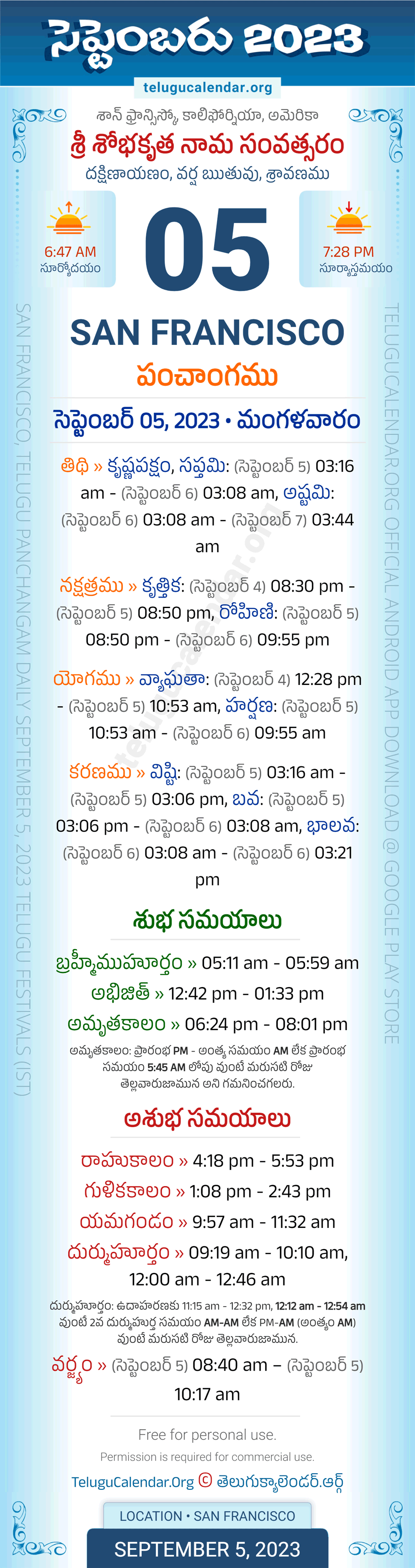 San Francisco Panchangam September 5, 2023 Daily Sheet in Telugu... San Francisco Telugu Panchangam Tuesday, September 05, 2023, Today's San Francisco Tithi: Krishna Paksham, Saptami: (Sep 5) 03:16 am - (Sep 6) 03:08 am, Ashtami: (Sep 6) 03:08 am - (Sep 7) 03:44 am, Today's San Francisco Nakshatram: Krithika: (Sep 4) 08:30 pm - (Sep 5) 08:50 pm, Krithika: (Sep 5) 08:50 pm - (Sep 6) 09:55 pm, Telugu Year: Sri Sobhakritu Nama Samvatsaram, Vedic Aayana: Dakshinayanam, Vedic Rutuvu: Varsha, Chandramasa (Amanta): Sravanamu. Below image showing information about the 5 attributes of the day, viz., Varam, Tithi, Nakshatram, Yogam & Karanam along with starting and end timings. Read more