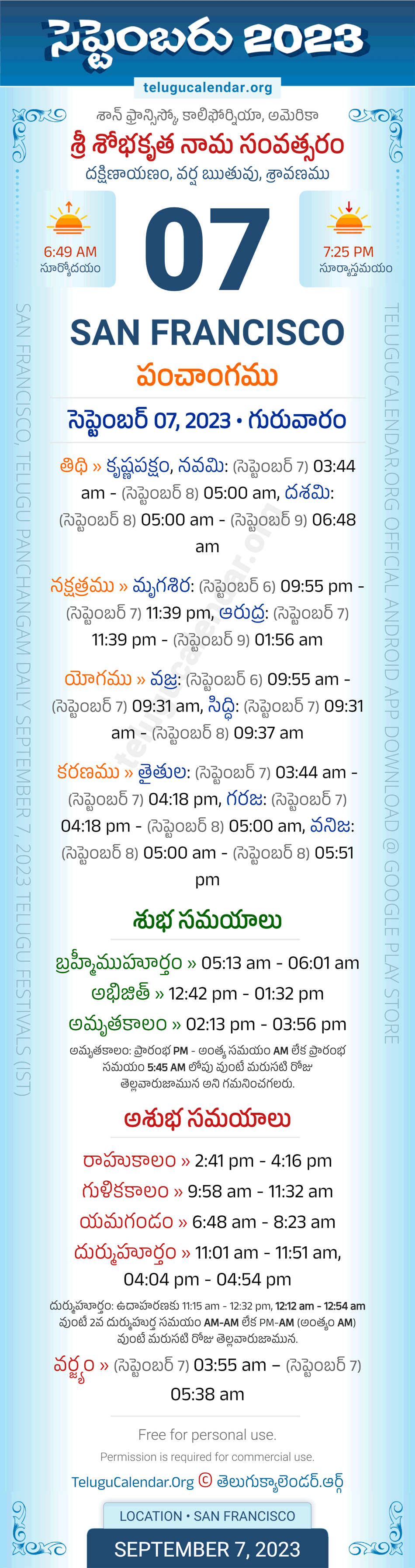 San Francisco Panchangam September 7, 2023 Daily Sheet in Telugu... San Francisco Telugu Panchangam Thursday, September 07, 2023, Today's San Francisco Tithi: Krishna Paksham, Navami: (Sep 7) 03:44 am - (Sep 8) 05:00 am, Dashami: (Sep 8) 05:00 am - (Sep 9) 06:48 am, Today's San Francisco Nakshatram: Mrigasira: (Sep 6) 09:55 pm - (Sep 7) 11:39 pm, Arudra: (Sep 7) 11:39 pm - (Sep 9) 01:56 am, Telugu Year: Sri Sobhakritu Nama Samvatsaram, Vedic Aayana: Dakshinayanam, Vedic Rutuvu: Varsha, Chandramasa (Amanta): Sravanamu. Below image showing information about the 5 attributes of the day, viz., Varam, Tithi, Nakshatram, Yogam & Karanam along with starting and end timings. Read more