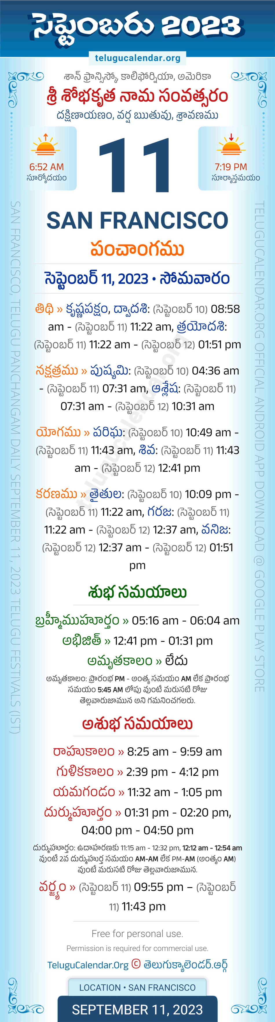 Apart from the Panchangam September 11, 2023 San Francisco Telugu Calendar Daily Sheet, you can also find the Sunrise and Sunset (Middle Limb) timings, Paksham, Telugu Year, Yanam, Rutuvu, Telugu Month. Today's San Francisco Auspicious Timings September 11, 2023 (Shubha Muhuratam Today Good Timings like Abhijit Muhurtham, Amruta Kalam & Brahma Muhurtham) and Today's San Francisco Inauspicious Timings September 11, 2023 (Bad Timings like Durmuhurtham, Rahukalam, Gulika kalam & Yamagandam) with starting and end timings in the above image.