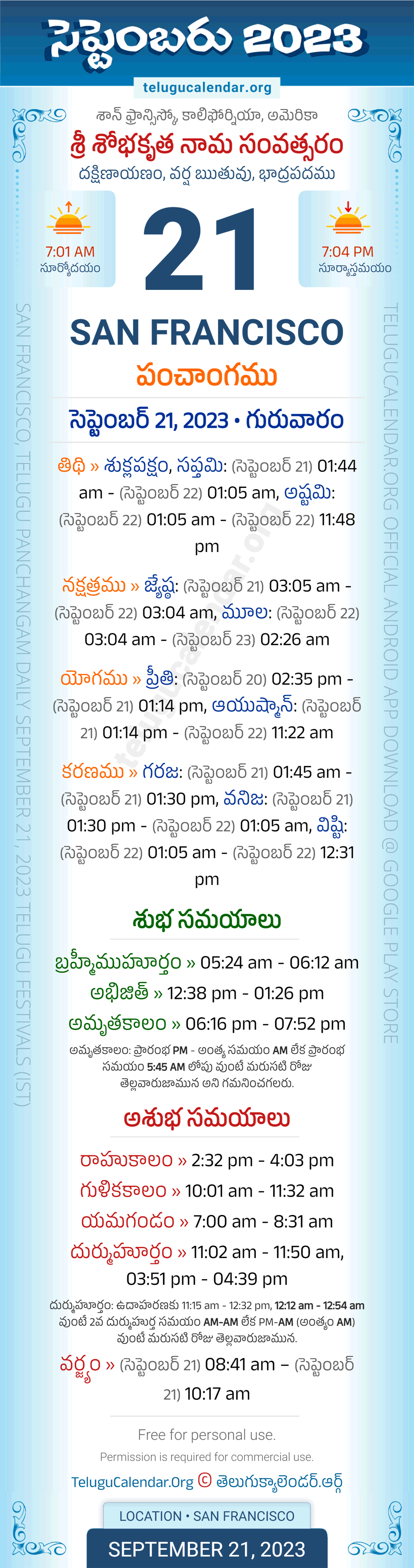 Apart from the Panchangam September 21, 2023 San Francisco Telugu Calendar Daily Sheet, you can also find the Sunrise and Sunset (Middle Limb) timings, Paksham, Telugu Year, Yanam, Rutuvu, Telugu Month. Today's San Francisco Auspicious Timings September 21, 2023 (Shubha Muhuratam Today Good Timings like Abhijit Muhurtham, Amruta Kalam & Brahma Muhurtham) and Today's San Francisco Inauspicious Timings September 21, 2023 (Bad Timings like Durmuhurtham, Rahukalam, Gulika kalam & Yamagandam) with starting and end timings in the above image.