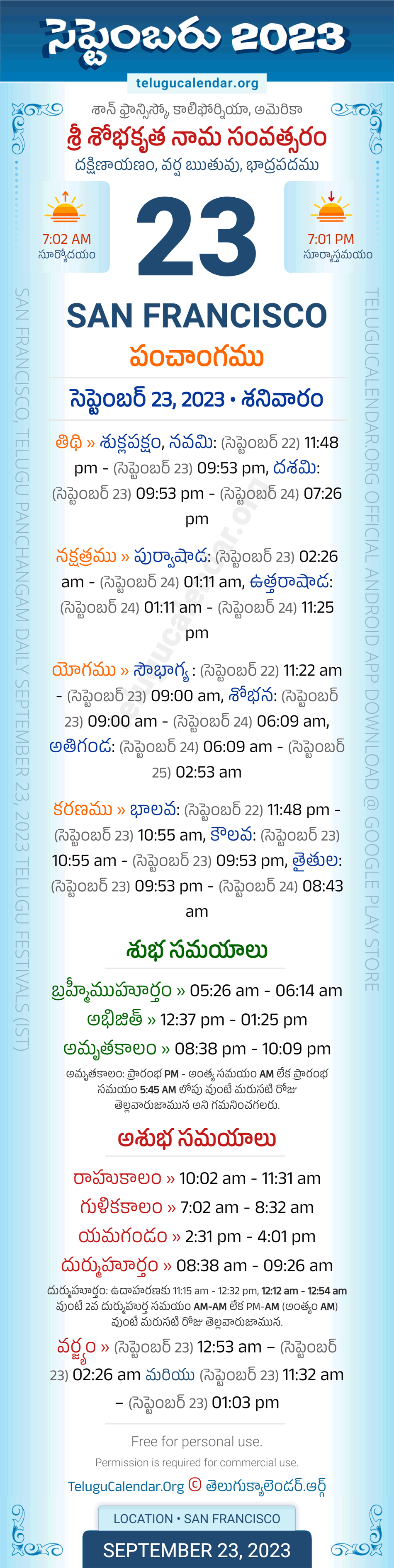 Apart from the Panchangam September 23, 2023 San Francisco Telugu Calendar Daily Sheet, you can also find the Sunrise and Sunset (Middle Limb) timings, Paksham, Telugu Year, Yanam, Rutuvu, Telugu Month. Today's San Francisco Auspicious Timings September 23, 2023 (Shubha Muhuratam Today Good Timings like Abhijit Muhurtham, Amruta Kalam & Brahma Muhurtham) and Today's San Francisco Inauspicious Timings September 23, 2023 (Bad Timings like Durmuhurtham, Rahukalam, Gulika kalam & Yamagandam) with starting and end timings in the above image.