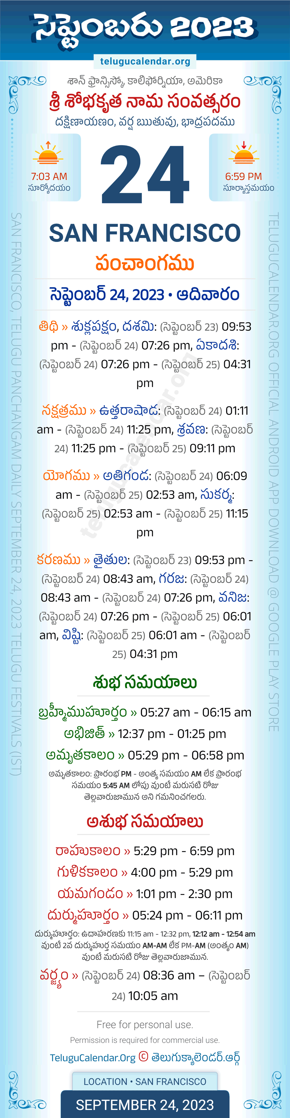 Apart from the Panchangam September 24, 2023 San Francisco Telugu Calendar Daily Sheet, you can also find the Sunrise and Sunset (Middle Limb) timings, Paksham, Telugu Year, Yanam, Rutuvu, Telugu Month. Today's San Francisco Auspicious Timings September 24, 2023 (Shubha Muhuratam Today Good Timings like Abhijit Muhurtham, Amruta Kalam & Brahma Muhurtham) and Today's San Francisco Inauspicious Timings September 24, 2023 (Bad Timings like Durmuhurtham, Rahukalam, Gulika kalam & Yamagandam) with starting and end timings in the above image.