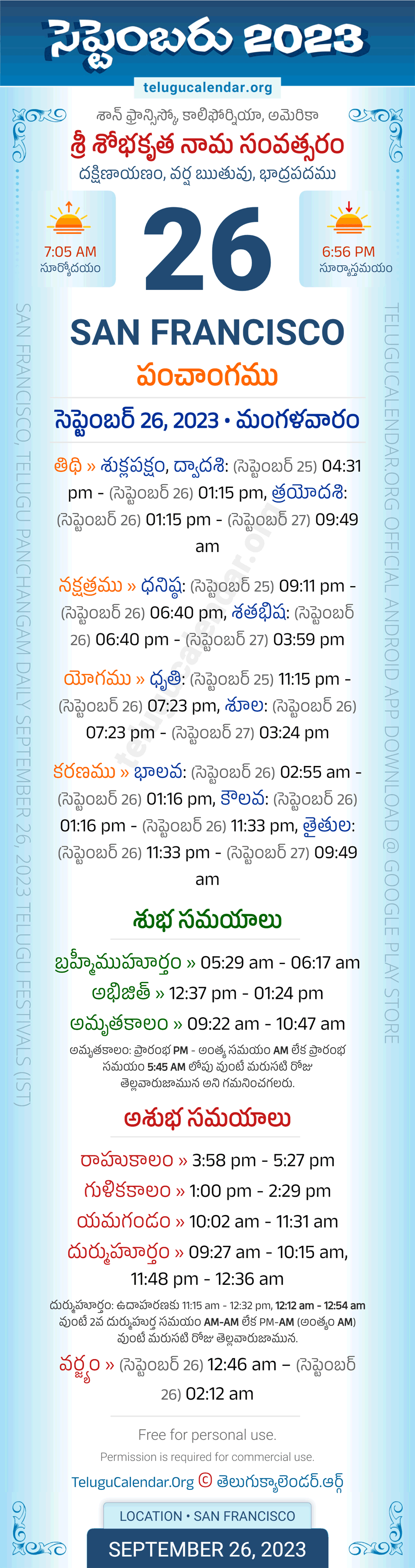 Apart from the Panchangam September 26, 2023 San Francisco Telugu Calendar Daily Sheet, you can also find the Sunrise and Sunset (Middle Limb) timings, Paksham, Telugu Year, Yanam, Rutuvu, Telugu Month. Today's San Francisco Auspicious Timings September 26, 2023 (Shubha Muhuratam Today Good Timings like Abhijit Muhurtham, Amruta Kalam & Brahma Muhurtham) and Today's San Francisco Inauspicious Timings September 26, 2023 (Bad Timings like Durmuhurtham, Rahukalam, Gulika kalam & Yamagandam) with starting and end timings in the above image.