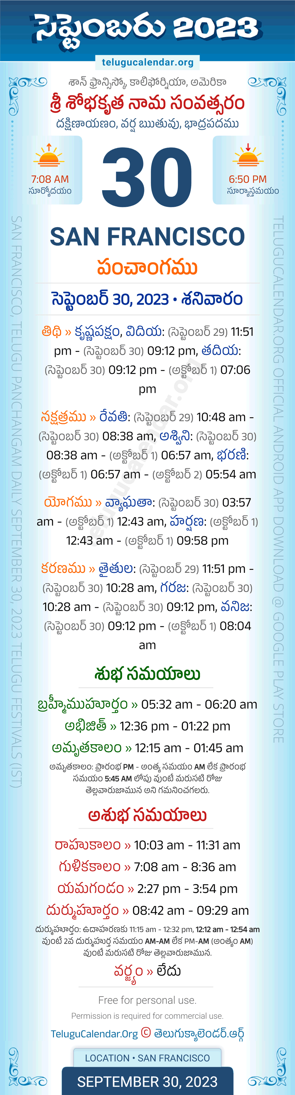 San Francisco Panchangam September 30, 2023 Daily Sheet in Telugu... San Francisco Telugu Panchangam Saturday, September 30, 2023, Today's San Francisco Tithi: Krishna Paksham, Vidiya: (Sep 29) 11:51 pm - (Sep 30) 09:12 pm, Thadiya: (Sep 30) 09:12 pm - (Oct 1) 07:06 pm, Today's San Francisco Nakshatram: Revathi: (Sep 29) 10:48 am - (Sep 30) 08:38 am, Aswini: (Sep 30) 08:38 am - (Oct 1) 06:57 am, Bharani: (Oct 1) 06:57 am - (Oct 2) 05:54 am, Telugu Year: Sri Sobhakritu Nama Samvatsaram, Vedic Aayana: Dakshinayanam, Vedic Rutuvu: Varsha, Chandramasa (Amanta): Bhadrapadamu. Below image showing information about the 5 attributes of the day, viz., Varam, Tithi, Nakshatram, Yogam & Karanam along with starting and end timings. Read more