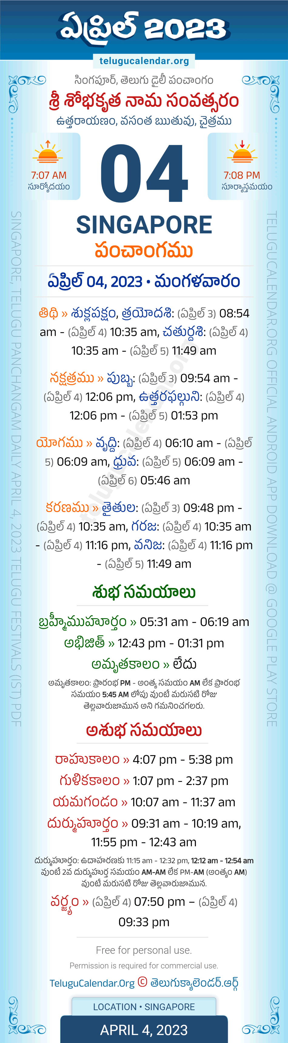 Download » April 4, 2023 » Singapore (Singapore) Telugu Panchangam Daily Sheet with Auspicious and Inauspicious Timings.