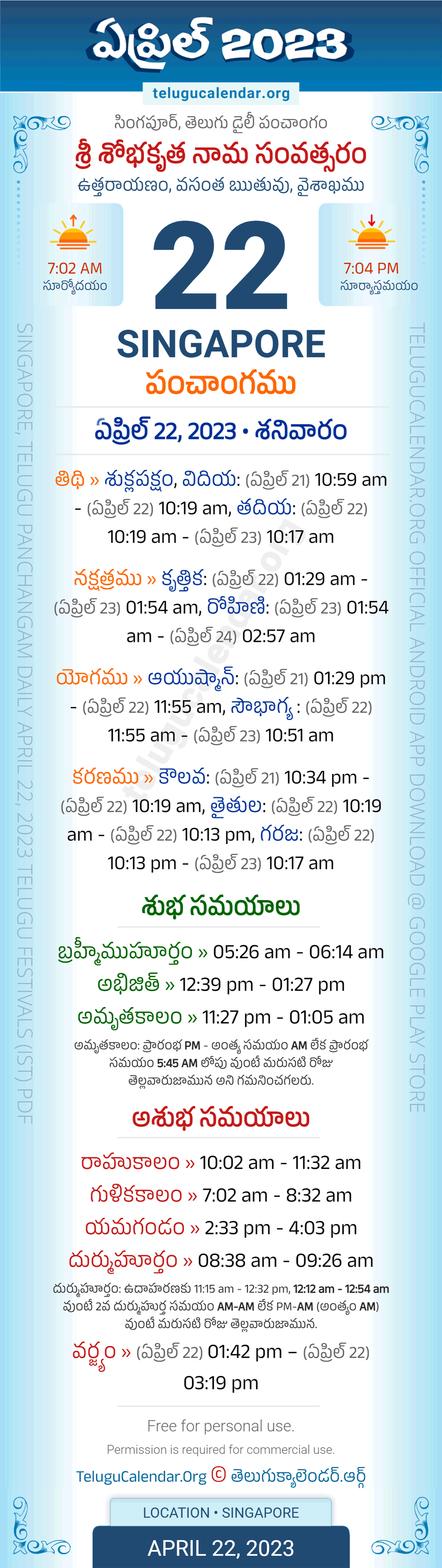 Download » April 22, 2023 » Singapore (Singapore) Telugu Panchangam Daily Sheet with Auspicious and Inauspicious Timings.