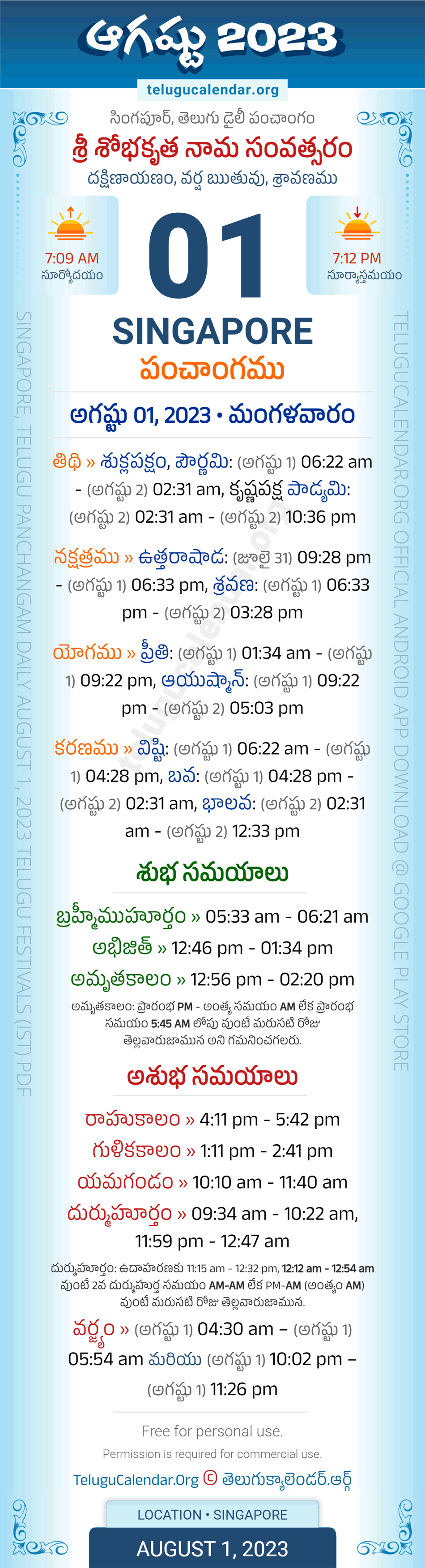 Download » August 1, 2023 » Singapore (Singapore) Telugu Panchangam Daily Sheet with Auspicious and Inauspicious Timings.