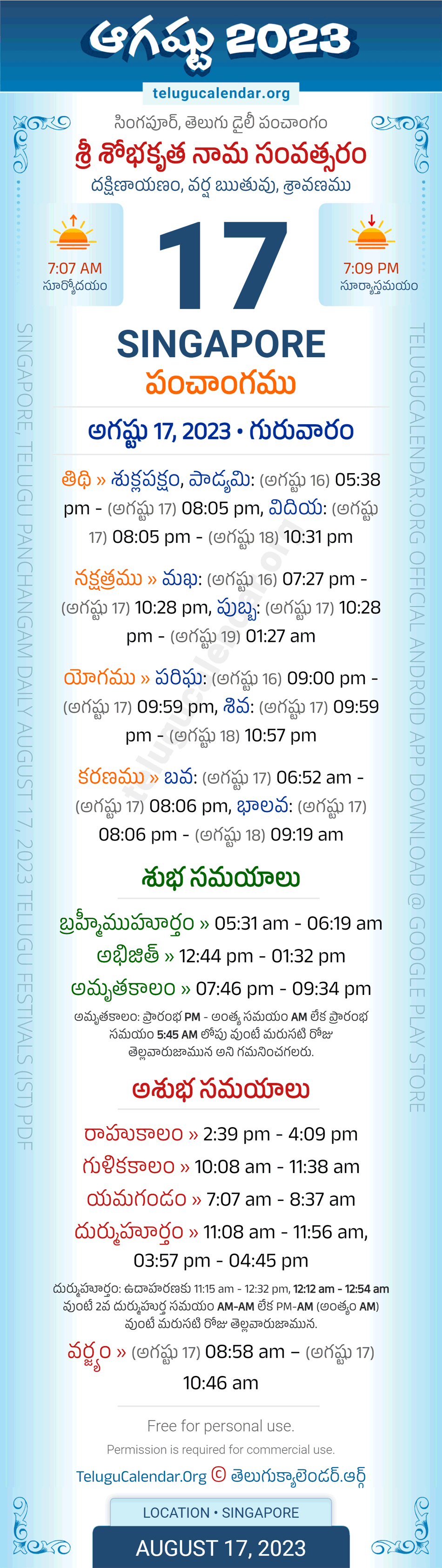 Download » August 17, 2023 » Singapore (Singapore) Telugu Panchangam Daily Sheet with Auspicious and Inauspicious Timings.