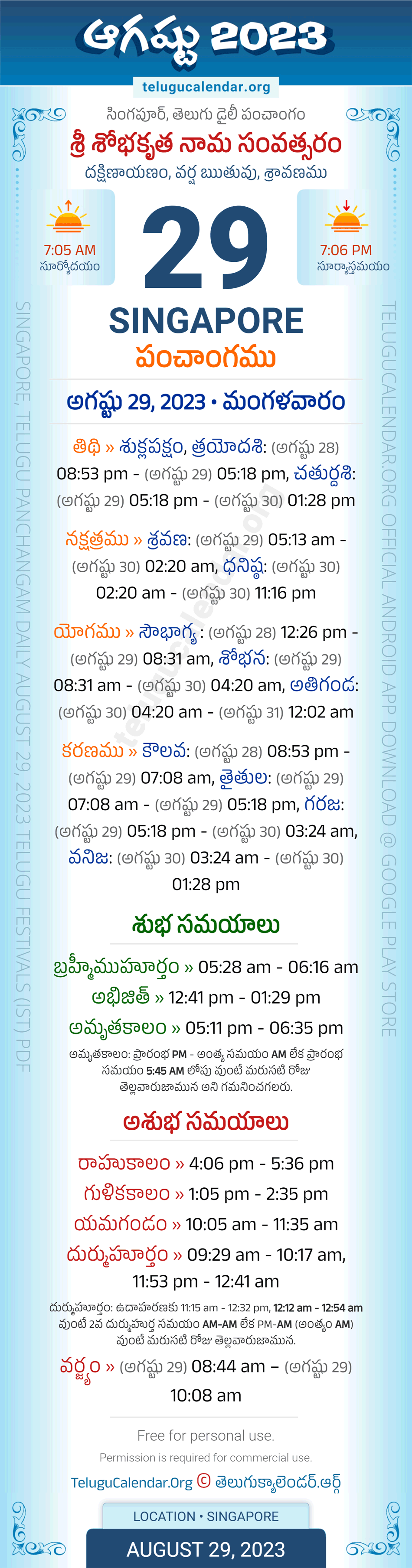 Download » August 29, 2023 » Singapore (Singapore) Telugu Panchangam Daily Sheet with Auspicious and Inauspicious Timings.