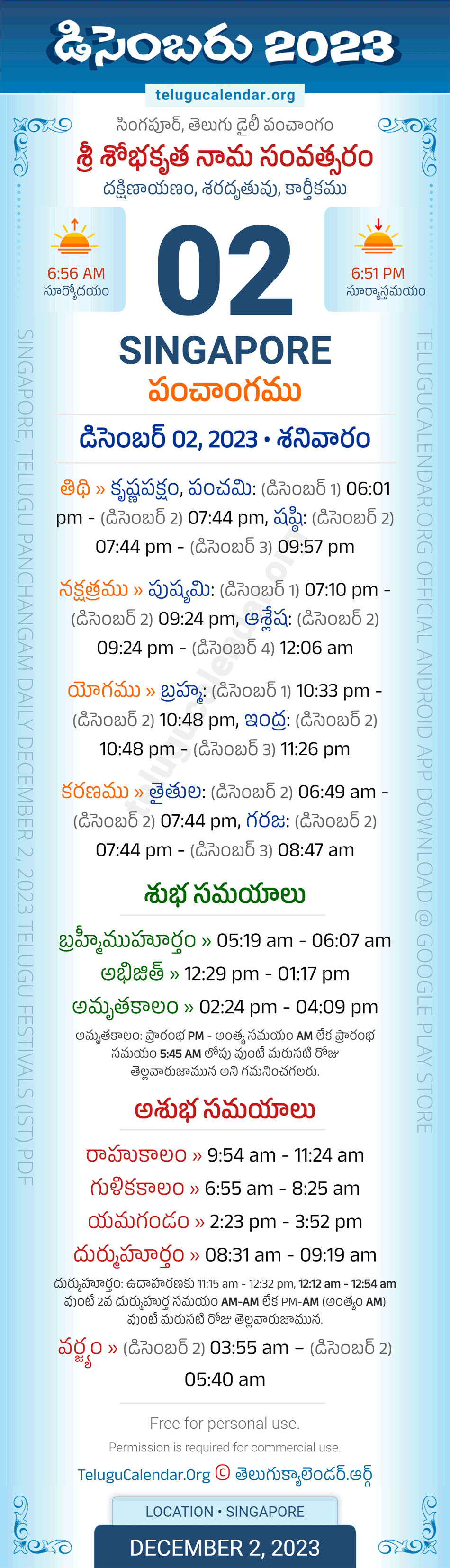 Download » December 2, 2023 » Singapore (Singapore) Telugu Panchangam Daily Sheet with Auspicious and Inauspicious Timings.