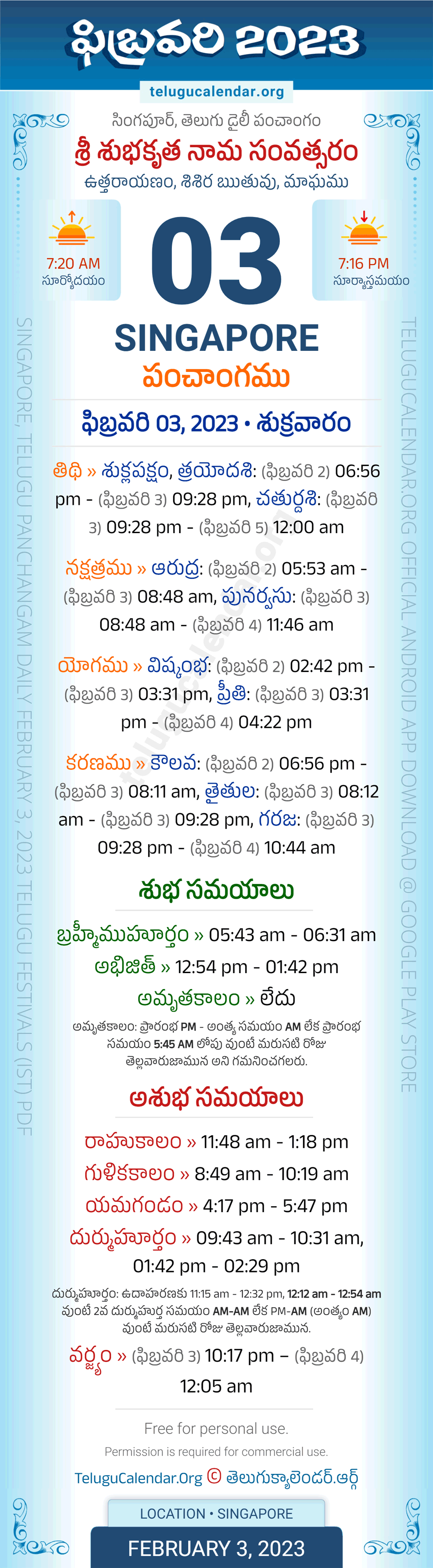 Singapore Panchangam February 3, 2023 Daily Sheet in Telugu... Singapore Telugu Panchangam Friday, February 03, 2023, Today's Singapore Tithi: Sukla Paksham, Trayodashi: (Feb 2) 06:56 pm - (Feb 3) 09:28 pm, Chaturdashi: (Feb 3) 09:28 pm - (Feb 5) 12:00 am, Today's Singapore Nakshatram: Arudra: (Feb 2) 05:53 am - (Feb 3) 08:48 am, Punarvasu: (Feb 3) 08:48 am - (Feb 4) 11:46 am, Telugu Year: Sri Subhakritu Nama Samvatsaram, Vedic Aayana: Uttarayanam, Vedic Rutuvu: Shishira, Chandramasa (Amanta): Maghamu. Below image showing information about the 5 attributes of the day, viz., Varam, Tithi, Nakshatram, Yogam & Karanam along with starting and end timings. Read more
