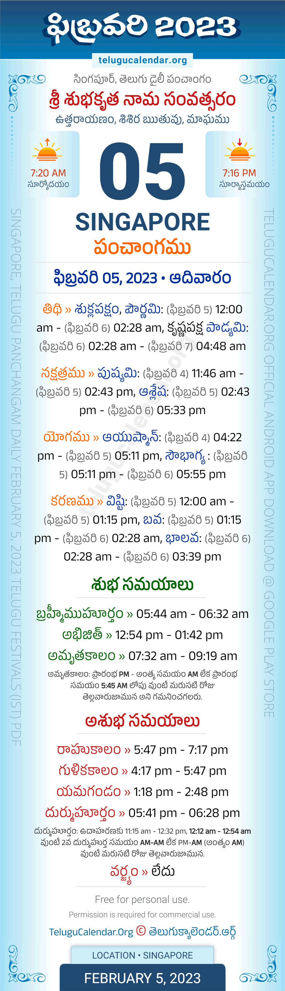 Download » February 5, 2023 » Singapore (Singapore) Telugu Panchangam Daily Sheet with Auspicious and Inauspicious Timings.