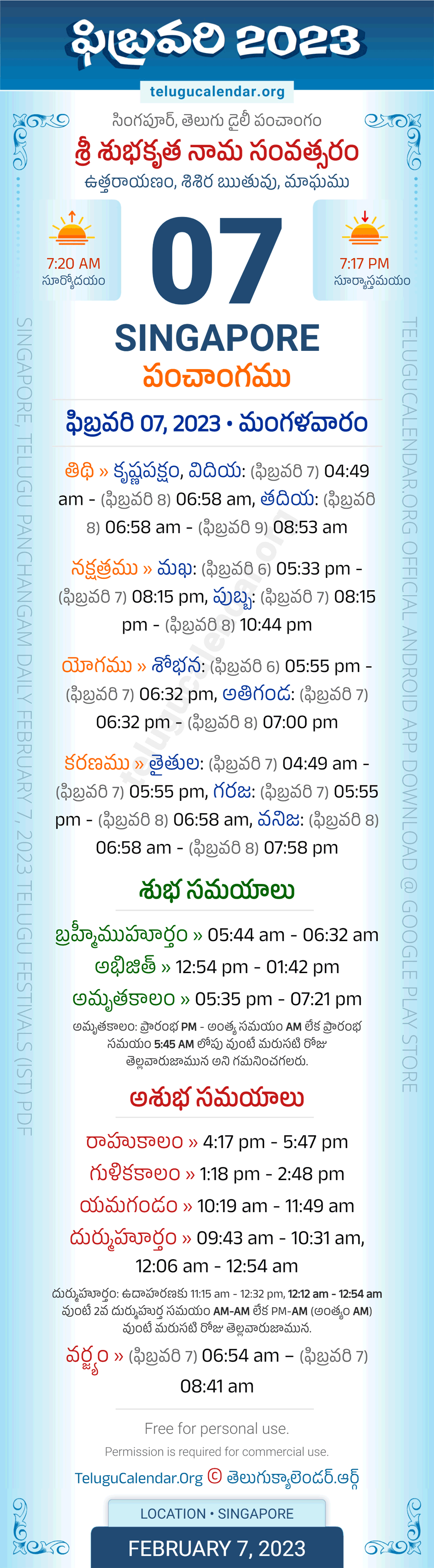 Download » February 7, 2023 » Singapore (Singapore) Telugu Panchangam Daily Sheet with Auspicious and Inauspicious Timings.