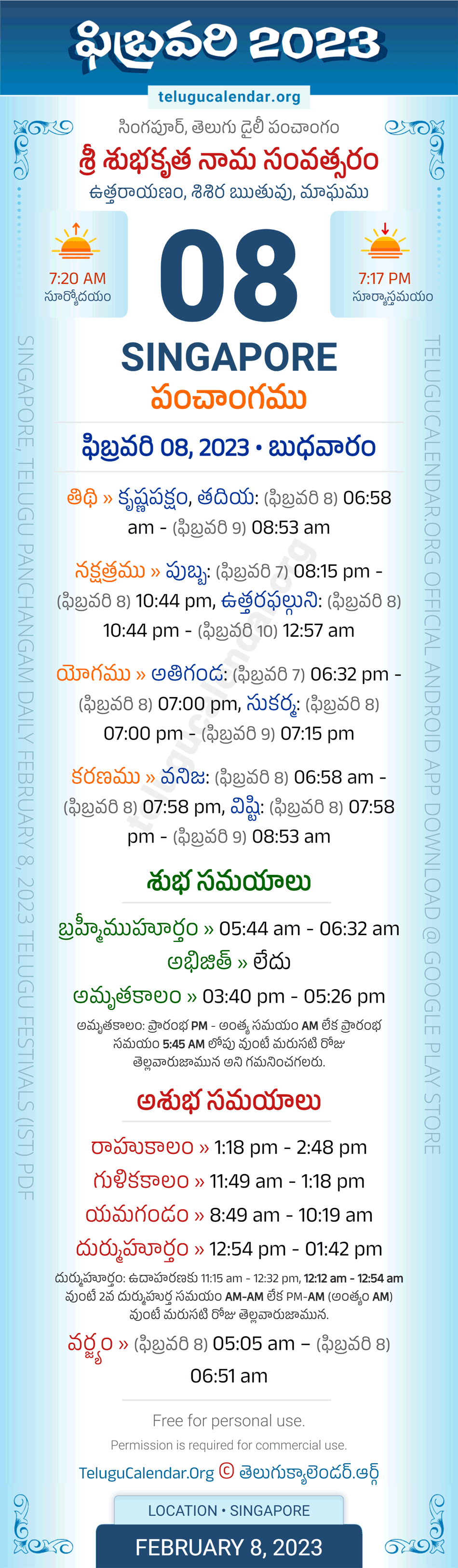 Download » February 8, 2023 » Singapore (Singapore) Telugu Panchangam Daily Sheet with Auspicious and Inauspicious Timings.